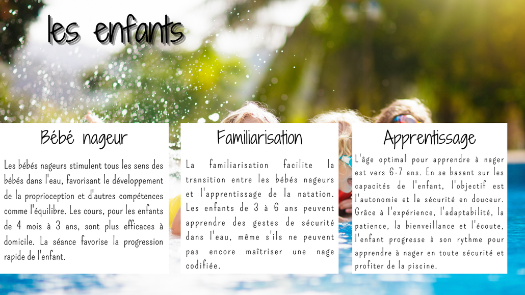 Pour bénéficier de cours de natation à domicile, il est préférable de disposer d'une piscine construite en dur. Dans ce cas, vous pouvez bénéficier des services mentionnés ci-dessous.